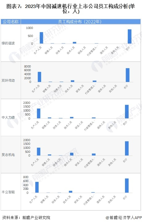 从减速机行业的上市企业已有的公开信息分析,员工总数最多的企业是双环传动,员工总数为7037人;其次是昊志机电,员工总数1830人。技术人员最多的是双环传动,技术人员总数为867人;其次是昊志机电,技术人员数量365人。销售人员数量最多的是昊志机电,总数为157人;其次是双环传动,销售人员数量153人。