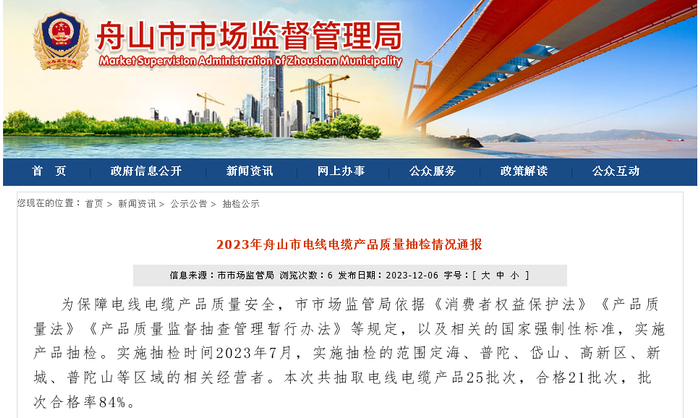 为保障电线电缆产品质量安全,市市场监管局依据《消费者权益保护法》《产品质量法》《产品质量监督抽查管理暂行办法》等规定,以及相关的国家强制性标准,实施产品抽检。实施抽检时间2023年7月,实施抽检的范围定海、普陀、岱山、高新区、新城、普陀山等区域的相关经营者。本次共抽取电线电缆产品25批次,合格21批次,批次合格率84%。