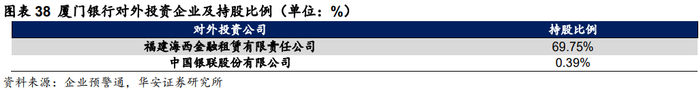 对外投资来看,厦门银行对外投资公司共2家。具体来看,厦门银行持有福建海西金租69.75%的股份;持有中国银联0.39%的股份。