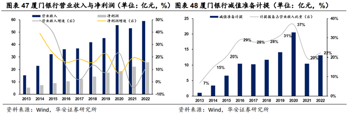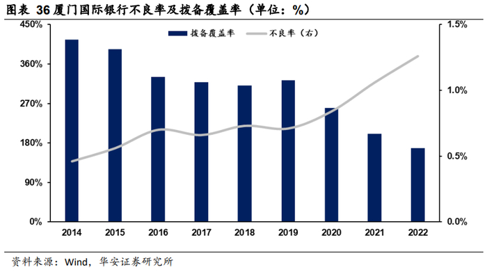 2022年计提50.1亿元减值准备,占营业收入比重的29%。2022年厦门国际银行营业收入为171.3亿,同比增速2%,净利润58.8亿,同比增速1.36%;2022年厦门国际银行计提减值准备50.1亿元,占当年营业收入比重的29%,较上年下滑2.5pct。