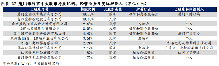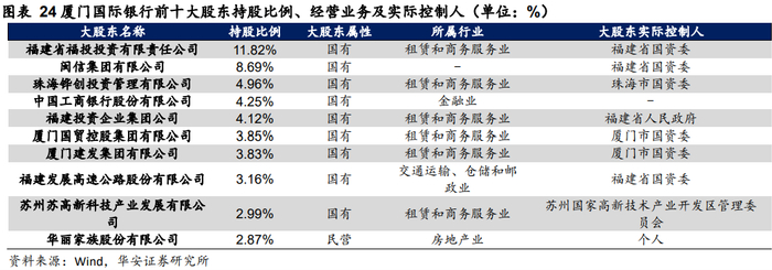 从股权结构上看,厦门国际银行的第一大股东为福建省福投投资有限责任公司,持股比例达11.82%,无控股股东。前十大股东包含9家国有企业、1家民营企业,其持股比例分别为47.67%、2.87%。