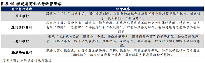 梳理福建省主要商业银行经营战略。福建省商业银行经营战略主要体现为服务中小企业,服务民众,这与福建省本土产业结构相适应。