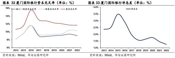 从资本充足率角度来看,2022年资本充足率下降至11.69%,较21年下行4bp,核心一级资本充足率为9.03%,较21年下行41bp,目前厦门国际银行存续50亿永续债和120亿二级资本债。从净息差角度来看,厦门国际银行2022年净息差为1.26%,较上年下降20bp。