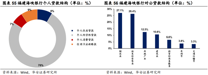 从个人贷款结构上看,福建海峡银行经营贷款占比较高,占比76%。公司类贷款结构来看,福建海峡银行投放的前五大行业分别为制造业、批发和零售、房地产、建筑业、租赁和商务服务,占比分别为27.1%、26.4%、12.5%、10.6%、6.6%。