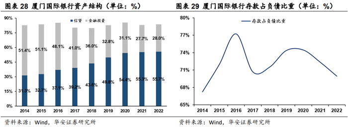 拆解资产负债结构来看,资产配置以贷款和投资资产为主,同业资产占比较低,2022年厦门国际银行资产投向中金融投资占比28.0%,较21年上升21bp,信贷占比55.7%,较21年上升了34bp,现金类资产占比较21年下降了1.12pct.负债端中存款占比69.9%,较21年下降了2.44pct。