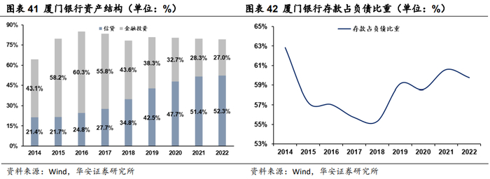 拆解资产负债结构来看,厦门银行信贷净额占资产总额的比重持续上升,2022年资产投向中信贷占比52.3%,较21年上升了86bp,金融投资占比27%,较21年下降了1.4pct,投资结构向标准化债券投资倾斜,非标资产投资规模收缩。负债端中存款占比59.8%,较21年下降了83bp。