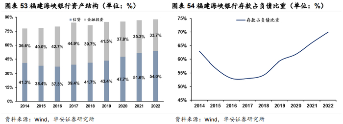拆解福建海峡银行资产负债结构来看,2022年资产投向中信贷占比54.0%,较21年上升2.4pct,金融投资占比33.7%,较21年下降1.6pct,金融投资主要以债券、信托及资管计划为主。负债端中存款占比70.0%,较21年上升3.9pct,福建海峡银行主动压降市场融入资金在负债总额的比重,市场融入资金占比有所下降。