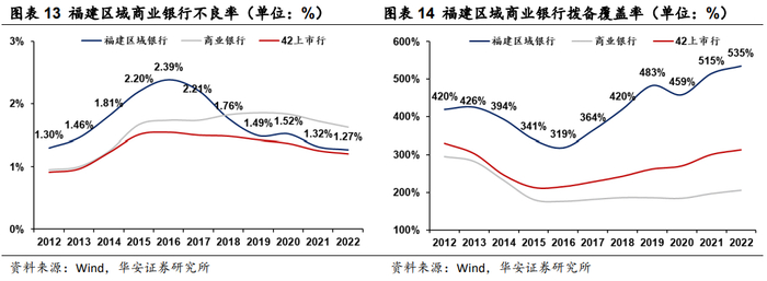 不良率下滑,拨备覆盖率提升,福建区域银行资产质量持续向好。不良率方面,2022年福建区域商业银行不良率为1.27%,较2021年下降5bp,低于商业银行均值。拨备覆盖率方面,福建区域中小行拨备覆盖率较高,带动区域拨备均值达535%,较上一年度上升20pct。(注:算数平均计算区域内银行不良率及拨备覆盖率,部分银行披露数据不全,计算结果可能存在一定误差,下同)