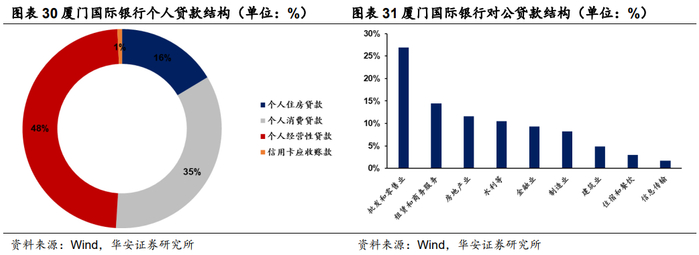 个人贷款来看,经营性贷款、消费贷款、住房贷款、信用卡贷款占比分别为48.2%、34.6%、16.4%、0.8%。公司贷款来看,前五大行业分别为批发和零售业、租赁和商务服务、房地产、水利等、金融业,占比分别为26.9%、14.5%、11.6%、10.6%、9.3%。