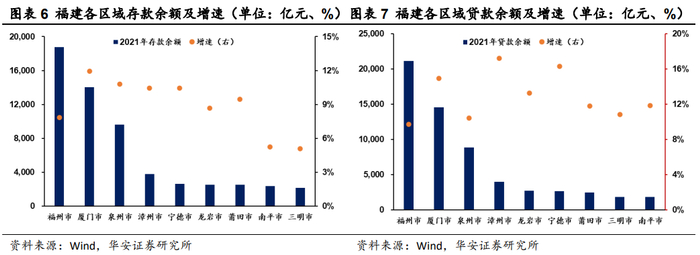 金融资源方面,总量数据方面,2022年福建省人民币存款与贷款金额分别为7.09万亿、7.41万亿,较上年同比增长17.0%、12.5%。分地市来看,福州市存贷款金额全省领先,厦门、漳州、宁德等区域存贷款增速较高。