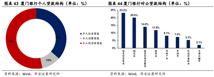 从个人贷款来看,经营性贷款、消费贷款、住房贷款占比分别为53.4%、10.2%、36.4%。从公司类贷款结构来看,前五大行业分别为批发和零售业、制造业、租赁和商业服务、建筑业、房地产,占比分别为23.2%、20.0%、14.0%、11.8%、8.1%。