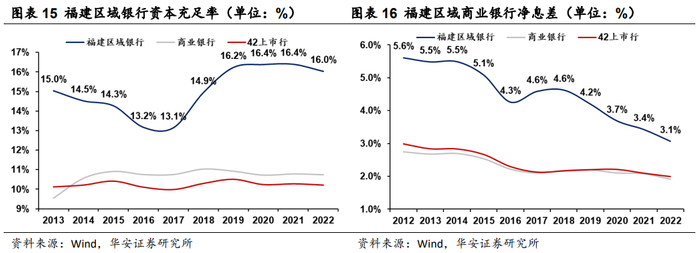 核心一级资本充足率高于商业银行与42家上市商业银行均值、净息差高于商业银行与42家上市商业银行均值。资本充足率方面,截至2022年福建区域内银行核心一级资本充足率为16.03%,高于商业银行均值与42家上市行均值,原因在于部分中小银行资本充足率较高。净息差方面,福建区域内银行净息差为3.07%,高于商业银行均值1.91%与42家上市行均值2%,但部分银行息差不足1.5%。