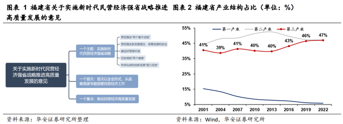 数字经济、海洋经济、绿色经济、文旅经济成为福建的新增长极,现代服务业发展提速增效,占福建省GDP的47%,民营经济贡献了全省约70%的GDP。“十四五”期间,福建省实施新时代民营经济强省战略,作出“一个主题”,“一个首次”,“一个重点”一系列部署安排。从全国各省市的GDP排名上看,2022年福建省GDP为5.31万亿,全国排名第8,分产业结构来看,第一、二、三产业占GDP比重分别为5.8%、47.2%、47%,其中第二产业中,福建省工业增加值为1.96万亿,总量全国第6位;规模以上工业增加值增长5.7%,增速稳居东部地区第1位;制造业增加值占GDP比重超过1/3。
