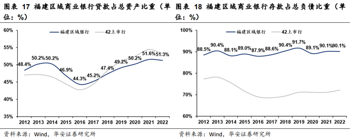 从资产规模较大的银行来看,兴业银行、厦门国际银行、厦门银行、福建海峡银行规模超2000亿。从定位上看,兴业银行作为股份行提出“商行+投行”战略,强调“客户为本、商行为体、投行为用”,走“商行+投行”差异化之路;厦门国际银行坚持“国际化”的战略定位,强化横跨陆港澳的战略布局优势;厦门银行网点实现福建地级市全覆盖,小微企业业务发展势头良好;福建海峡银行福州地区存款市场份额较稳定,深耕区域经济,小微企业的信贷投放力度较大。
