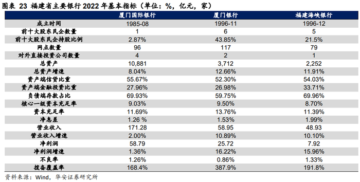 厦门银行:成立于1996年11月,是大陆首家具有台资背景的城市商业银行。前三大股东分别为金圆投资集团、富邦金控、北京盛达兴业房地产,其中富邦金控持有富邦华一银行42.09%的股权和厦门银行18.03%的股权。网点分布来看,厦门银行现有117家网点,其中厦门39家,福州17家,异省分支机构12家,均分布于重庆。2022年厦门银行资产端贷款占比52.3%,较上年提升86bp,金融投资占比27%,较上年下降1.36pct,负债中存款占比59.75%。贷款端结构来看,公司贷款占比51.7%,以批发零售、制造业为主,存款端公司存款占比56.2%,保证金存款占比较高。2022年资本充足率为13.76%,净息差为1.53%,当年计提拨备13.11亿元,占营业收入的22.24%,不良贷款率为0.86%,较上年下降5bp,拨备覆盖率为387.93%,较上年提升17.29pct。