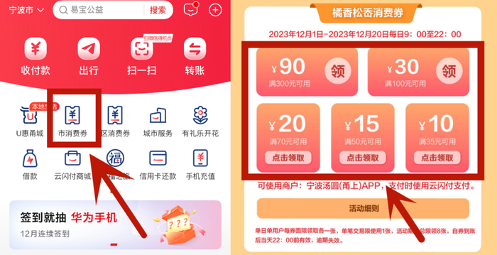 每天上午9点,宁波市民登录云闪付APP进入“市消费券”主页面,领取“橘香松岙消费券”,并通过甬上好物商城下单即可。
