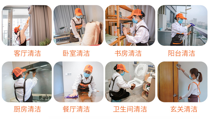 全屋8大区域6小时日常保洁,除尘、去油、去污、去霉、清洁,均由团队自备专业工具。