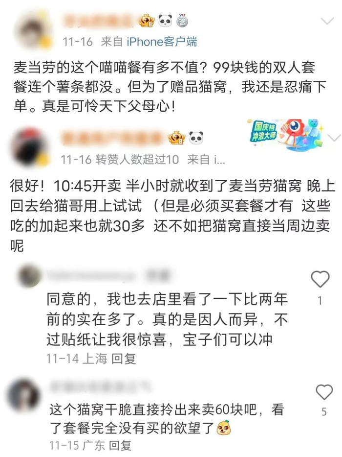 “无法抗拒猫咪相关的周边!”“是谁会为了猫窝买99元双人餐啊?是我……”“快餐不是很想吃,但周边一定要拿下!”有网友称,自己平时很少吃快餐,但热衷于收集宠物周边,所以毫不犹豫地下单了。