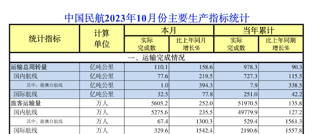 根据中国民用航空局11月20日发布的中国民航2023年10月份主要生产指标统计,我国国际航线运营情况持续恢复。