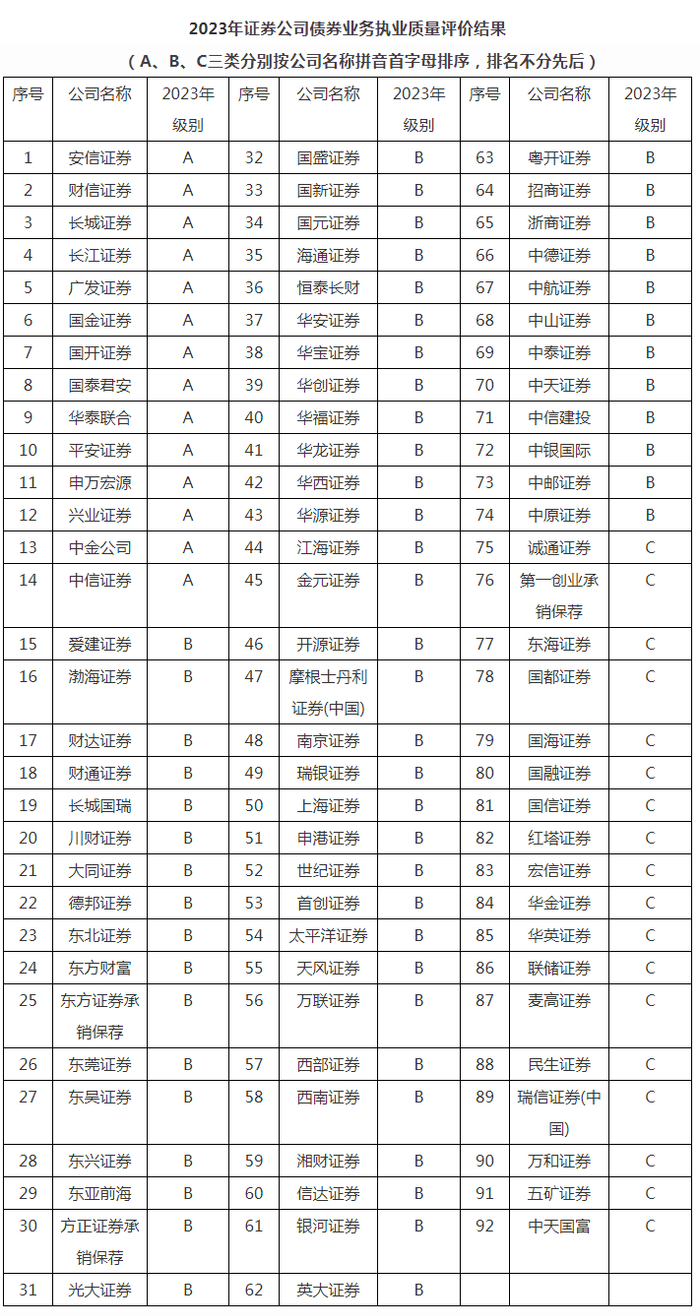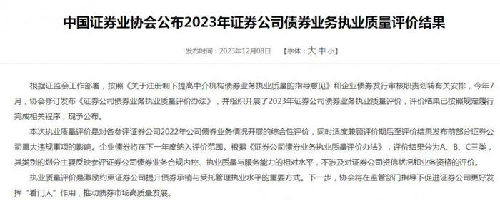 12月8日,中国证券业协会公布2023年证券公司债券业务执业质量评价结果,合计92家券商参评,共14家券商获A类评价,60家获B类,18家获C类。