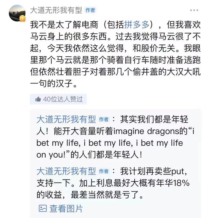 段永平表示,“自己并不了解电商(包括拼多多),但喜欢马云身上的很多东西。过去我觉得马云很了不起,今天我依然这么觉得,和股价无关。”