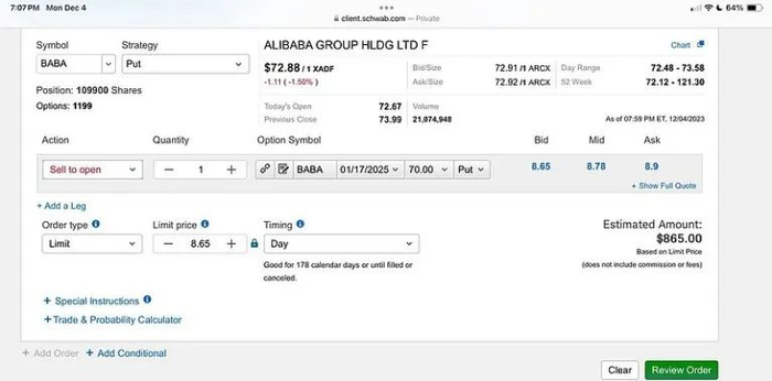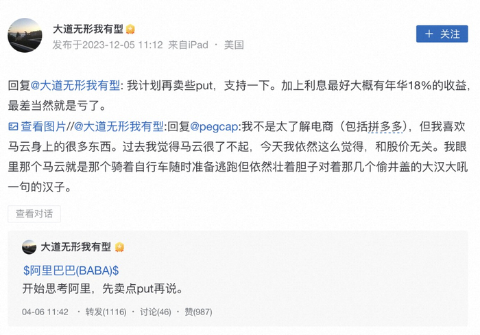 12月5日,段永平在雪球上,晒出一张交易图片,他在12月4日卖出阿里“看跌期权”。这意味着他看涨今后13个月阿里股价。