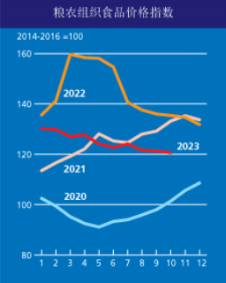 12月8日,联合国粮农组织发布11月份全球食品价格指数。2023年11月平均为120.4点,与10月修正后的指数持平,同比下跌10.7%。