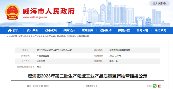 【山东】威海市2023年第二批生产领域工业产品质量监督抽查结果公示
