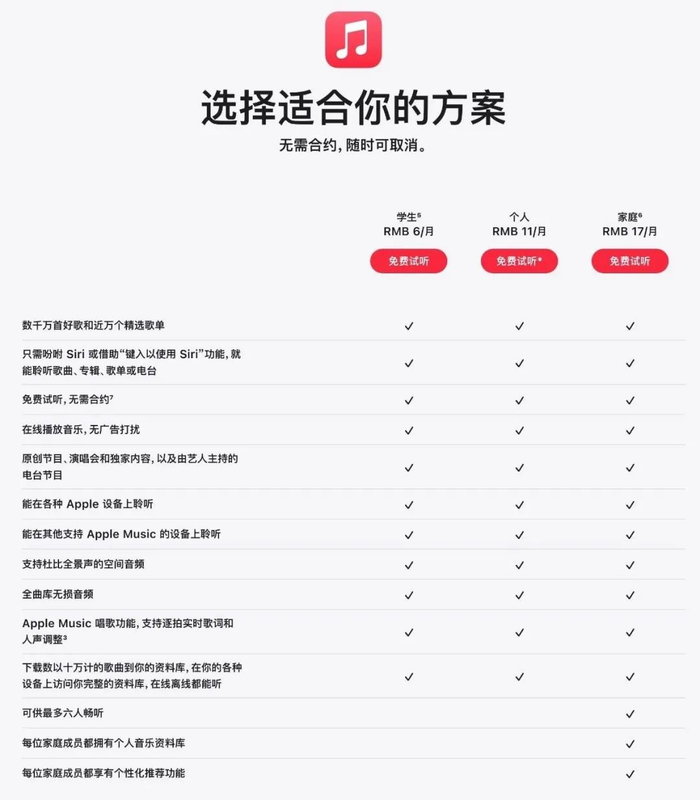 苹果官网显示,Apple Music国区订阅价格现已调整为:学生订阅价格为6元/月;个人订阅价格为11元/月;家庭订阅价格为17元/月。相比之前的5元/学生、10元/个人、15元/家庭,上调了1-2元。新用户现在订阅就是新价格了,之前订阅的老用户预计是下个月账单开始新价格。