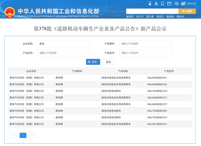 工信部公示第378批《道路机动车辆生产企业及产品公告》,多款“蔚来牌”车型在列