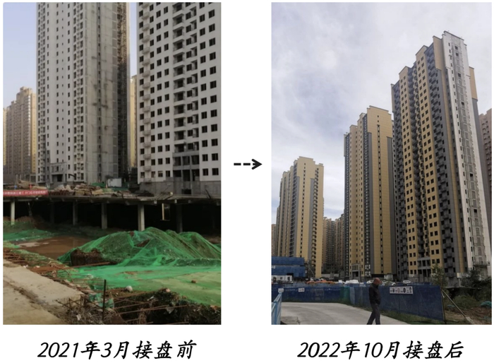 对比接盘前的破败骨架,如今工地现场楼盘外立面已经被粉刷,不时有施工声传出