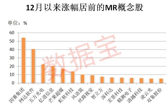 昨日盘面上, MR概念股已出现明显异动,五方光电、网达软件、工业富联均录得涨停板。12月以来MR概念股中,因赛集团、网达软件、五方光电、亿道信息均涨超20%。