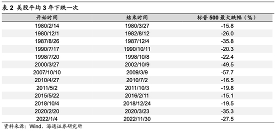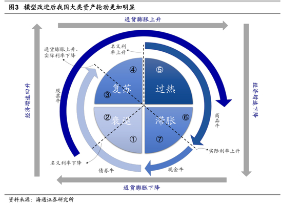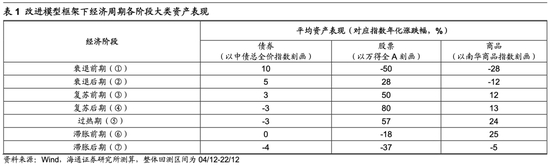 例如借鉴美国的经济发展经验,尽管美国经济增速长期来看是下行的,但在一段时期内依然是围绕着中枢水平周期波动的,80-90年代美国GDP增速中枢在3.5%上下,科网泡沫破灭后(2001-2007年)降至2.5%,金融危机爆发后(2008至今)进一步降至1.8%。中国经济同样存在类似的周期规律,2010年之后随着中国经济转型,GDP增速也持续下滑,2020年以来这一中枢降至5%左右。尽管2023年我国经济相较2022年已开始逐渐修复,但直至23Q3中国GDP累计同比为5.2%,两年平均增速仅4.1%,仍低于中枢水平。对于资本市场,由于宏观经济周期是股市运行的大背景,因此在经济周期的不同阶段资本市场也会出现相应的周期轮回规律。基于我们改进的投资时钟分析(如图3及表1所示),大类资产轮动顺序为债牛-股牛-商品牛-现金牛,投资时钟走完一圈需要三年半左右。其中股市往往在经济进入滞胀期和衰退前期时下跌,并在宏观政策转向宽松的衰退后期开始企稳。具体来看,首先借鉴美股,股市走势是周期轮回的,美股平均每3年下跌一次。从A股历史来看,A股也具有明显的周期特征。回顾A股2005年以来的走势,我们可以发现A股每隔3-4年会出现一次大的底部。以上证综指刻画,05年以来分别有05年6月、08年10月、12年12月、16年1月和19年1月五次历史大底;如果改用沪深300刻画,五个底部的时间与上证综指刻画的结果也基本一致。