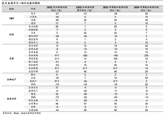 中观行业方面,科技和消费或是拉动24年A股盈利增长的主要驱动力。科技方面,政策层面当前正加快发展新质生产力,持续加大对科创的支持力度;技术层面AI技术不断迭代发展并在各领域加速落地。在此背景下,科技产业链上的相关公司业绩有望快速增长,预计A股科技板块24年归母净利润同比增速有望达20%左右,是大类行业当中增速最快且环比改善幅度最显著的。其中,受益于全球半导体周期见底回升以及AI算力需求爆发的电子行业增速最快。消费方面,中短期看政策发力下居民消费倾向与消费信心有望改善,中长期看产业转型升级将带动居民收入水平提升、同时催生新的消费需求。因此,我们预计24年A股消费板块归母净利润同比增速或将达20%左右,其中重点关注反腐影响淡去、养老需求增长的医药和受益于文娱消费新需求的社服行业。金融地产方面,随着经济复苏以及活跃资本市场措施持续落地,预计A股金融地产板块24年归母净利润同比增速有望回升至5%左右,其中保险、券商改善幅度最大。能源材料方面,受上游资源品涨价影响,预计24年能源与材料板块盈利增速有望回升至5%。制造方面,受新能源产业降温影响,预计A股制造板块24年归母净利润同比增速或降至3%左右,结构上仍可关注军工、汽车。具体数据详见表4和表5。