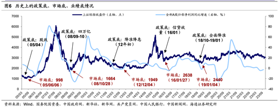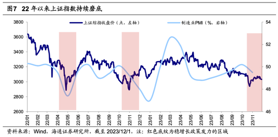 过去一年经济和股市背景较复杂。如前文所述,历史上来看2005年以来A股每隔3-4年会出现一次大的底部。参考借鉴历史上A股的底部,历次调整中市场大底多是反复震荡筑底。一般政策底首先出现,是指宏观利好政策逐渐出台的时间区间。随着积极政策推动经济和股市基本面企稳回升,A股上市公司利润增速、宏观工业增加值同比、制造业PMI等指标见底反转标志着业绩底到来。由于在政策宽松的初期,基本面还有下行压力,在这个过程中有政策利好与基本面下行两股力量角力,因此政策底与业绩底之间存在市场底。对于本轮情况而言,实际上22年4月开始A股已整体处在政策底的区间中,但这次A股底部区域相较历史情况确实拉得更长,主要是源于本次经济运行及外部环境更复杂。