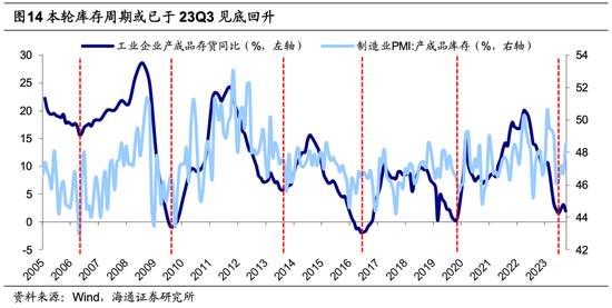 我们还可以从库存周期视角分析中国经济当前的位置。由于库存变化反映了市场需求预期和企业生产状况,同时能够间接反映宏观经济景气的变化,所以通过分析库存周期的变动可以追踪宏观经济所处的周期区间,我们主要用工业企业产成品库存这一指标刻画库存周期。回顾历史,2000年至今中国经济共经历了4轮完整的库存周期,平均一个周期历时39个月,其中上升和下降周期平均持续21个月、18个月。本轮库存周期始于2019年3季度末4季度初,高点出现在2022年4月,目前来看或已经于23年7月见底,从23年8月以来的数据看库存周期或已经处于从周期底部回升的趋势中。