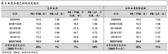 周期底部再确认。23年A股行情走势一波三折,在海内外的扰动下,5月以来上证指数陷入调整、年内最大回撤约15%;沪深300、万得全A则早在1月末、2月初就陆续开始调整,其中沪深300年内最大回撤已接近20%。从交易、资产比价、估值指标来看,截至23年10月低点(2023/10/23,下同)时A股调整幅度已经显著,市场情绪和风险偏好都降至低位。例如从交易指标看,交易热度已下滑至低位,部分指标显示市场情绪已接近去年10月底水平。从周换手率看,周换手率于5月初开始回落,23年10月市场低点周换手率(年化)为248%,低于22/10市场底部时的276%。从成交情况看,全部A股五日平滑成交量已从5月初的高点回落,23年10月市场低点全A五日平滑成交量为658亿股,低于去年10月底时市场成交量695亿股。从估值来看,23年10月低点时A股PE/PB估值水平与历史大底时已经较为接近。今年10月低点时全部A股PE(TTM,下同)为16.3倍、处05年以来从高到低24%分位,全A剔除金融为24.9倍、处35%分位;全部A股PB(LF,下同)为1.47倍、处05年以来从高到低1%分位,全A剔除金融为1.9倍、处11%分位。从大类资产比价指标看,当前市场的风险偏好也已处在历史低位。2023/10/23时A股风险溢价率(1/全部A股PE-10年期国债收益率)为3.4%、处05年以来从高到低18%分位,已经高于05年以来均值+1倍标准差(3年滚动);A股股债收益比(全部A股股息率/10年期国债收益率)为0.84、处05年以来从高到低0%分位,达05年以来均值+2倍标准差(3年滚动)附近,接近去年10月底水平,可见市场的风险偏好已处在底部。