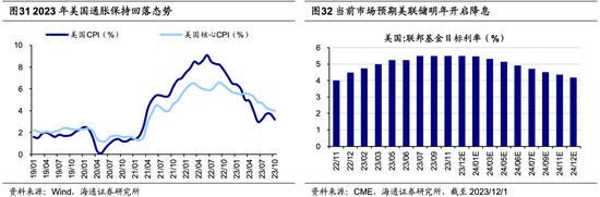 随着货币政策逐步宽松和美债供需压力持续缓解,美债利率或步入下行周期。从货币政策看,制约美联储开启降息的两大因素在缓解。通胀方面,二手车价格回落、租金通胀缓解有望带动短期核心通胀延续下行;就业方面,9月美国每位失业者对应1.50个职位缺口,保持下行趋势,可见劳动力市场紧张状况在缓解。据此我们预计美联储加息周期或将终结,年内大概率不再加息,甚至明年可能开始降息。根据芝商所FedWatch数据,截至2023/12/1,市场认为美联储在明年5月将基准利率下调25个基点的可能性已达48.3%。此外,从美债供需变化看,当前美债供需端的压力也在缓解。供给端,美国财政融资规模正逐步减少,长债增发速度也有所放缓;需求端,尽管短期美债高利率对海外投资者仍有较大吸引力,但长期看美联储加息结束后共同基金有望迎来资金回流。在货币政策和美债供需方面的积极变化下,明年美债长端利率大概率要震荡回落。