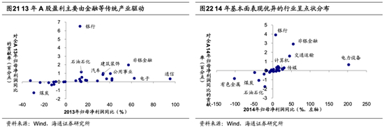 13-14年企业盈利表现偏弱主要是因为行业层面未能出现基本面强劲的主导产业。13年整体来看,A股盈利主要由金融等传统产业驱动,例如银行、非银归母净利增速分别贡献了全A增速6.5、2.0个百分点。但除此之外,中观层面并未出现其他增长动力,比如当时受益于智能手机普及的电子和通信,虽然增速很快,但两者都仅拉动全A增速0.4个百分点,贡献较小。14年行业盈利表现出现分化,金融等传统行业对A股盈利的拉动作用趋弱,尽管出现交运、电力设备、传媒、计算机等盈利增长较快的行业,但这些行业呈点状分布,没有形成产业链式的拉动作用。