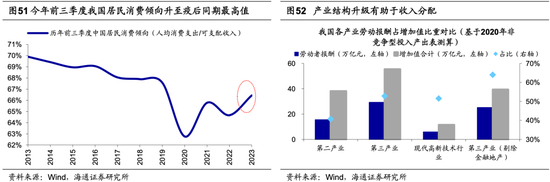 23年以来消费板块在大类行业中表现靠后,年初至今申万大类行业分类下消费涨跌幅仅为-9.8%。经历较长时间的调整,当前消费板块整体估值已经不高,大消费板块PE为53.6倍、处13年以来54%分位,与此同时,大消费板块的基金持仓已降到历史低位,23Q3基金对大消费板块的超配比例为9.9个百分点,处13年以来26%分位。而当前消费的基本面正处在复苏趋势中,部分消费细分领域出现的新业态成为消费的结构性亮点。展望2024年,我国积极的财政政策仍有一定的发力空间,政策支撑下随着国内经济运行进一步好转,疤痕效应逐渐褪去,今年前三季度居民人均消费支出占可支配收入的比重已经达到66%,为疫情后同期最高值,我国居民的收入预期和消费倾向有望迎来更持续性的修复。中长期看,借鉴别国发展经验来看,经济结构转型升级是中等收入向高收入国家群体跨越的关键因素,当前我国正加速建设新质生产力,推动产业结构升级,这将进一步提升我国国民收入并优化当前收入分配机制向居民端倾斜,我国消费修复的潜力有望进一步释放。