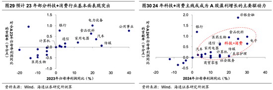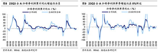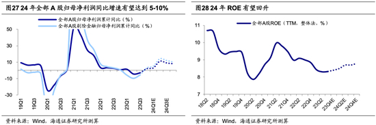 A股盈利周期有望向上,预计24年全A归母净利润同比增长5-10%。就A股整体而言,24年中国经济将延续复苏的趋势,支撑企业盈利逐步回升。24年货币政策或维持进一步稳健宽松,政策利率仍有一定调整空间;财政政策继续支撑经济需求端,财政总量仍有进一步释放的空间和潜力;地产方面,借鉴海外经验,随着地产宽松政策持续推进,明年地产销售或略好于今年;消费方面,政策支持下明年消费修复潜力有望进一步释放,预计24年国内社消零售增速有望达到5.5%左右。综上所述,随着稳增长政策持续发力,叠加库存周期进入补库阶段,明年国内经济运行有望进一步好转,结合海通宏观预测,我们认为24年国内实际GDP同比增速有望达5%左右。落实到微观企业盈利层面,在经济回暖的背景下,我们预计A股盈利将持续复苏,24年全部A股归母净利润同比增速有望达到5-10%。