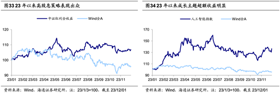 今年以来行业风格呈现哑铃型的特征。回顾今年以来的A股行情,风格上呈现“高股息+科技成长”两头占优的哑铃型表现,今年至今(截至23/12/01)中证红利全收益指数涨幅为7.5%,人工智能指数为42%,明显高于同期万得全A涨跌幅的-3.0%。高股息策略占优的背后原因是今年以来我国步入疫后阶段,但经济修复呈现波浪式发展、曲折式前进的过程,基本面修复遭遇波折使得市场对宏观经济的预期不稳定,投资者倾向于在不确定性的市场中追求确定性的收益,因此今年以来高股息策略收益较好。同时,今年ChatGPT为代表的人工智能超大规模预训练模型,凭借其良好的通用性和泛化性,显著降低AI的应用门槛,推动AI技术在各领域大规模落地,因此在存量资金博弈的背景下,人工智能为代表的科技主题型投资机会吸引了大量活跃资金,今年以来相关板块相对大盘取得了明显的超额收益。