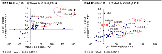 16-17年企业盈利强劲主要受益于资源品和地产链盈利高增,形成强有力的拉动。资源品方面,16年供改背景下钢铁、煤炭、有色行业盈利增速最快,共拉动全A增速上升4.1个百分点;17年钢铁、煤炭的盈利增速仍最快,同时由于海外设备投资需求上行,机械、化工的盈利增速明显改善,共拉动全A增速上升2.3个百分点。地产链方面,受益于棚改,16年银行、地产的盈利增速率先修复,共拉动全A增速上升2.6个百分点;17年棚改利好逐步延伸至地产链下游,轻工、家电等行业盈利显著修复,分别拉动全A盈利增长0.3、0.5个百分点,此外甚至还带动了食饮等其他消费板块的盈利改善。