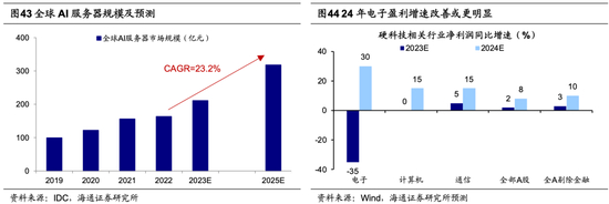 ①半导体周期见底回升,电子基本面有望加速修复,性价比或更优。当前多项指标显示全球半导体产业有望见底回升,23/09全球半导体销售额当月同比增速回升至-4.5%,连续5个月回暖。另外,消费电子领域数据也对半导体周期见底回升形成验证,23Q3全球智能手机出货量环比增速转正,我国智能手机出货量当季同比增速为17.6%,连续3个季度回升。此外,AI浪潮下算力需求爆发,AI服务器市场规模有望快速扩容,支撑电子行业景气向上。根据IDC,2025年全球AI服务器市场规模将达318亿美元,23-25年期间CAGR为22.7%。综合来看,在全球半导体周期见底回升,叠加AI算力需求爆发,电子基本面有望逐级向上,根据海通行业分析师的预测,24年电子行业归母净利增速将达30%,是科技中改善最明显的行业。