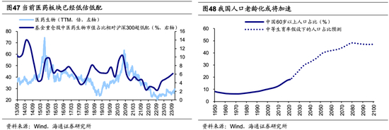 白马成长中还应重视医药。当前医药板块的估值和基金配置仍处于历史较低水平:从估值看,医药PE(TTM)为30倍,处13年以来20%分位;从基金持仓看,23Q3基金对医药超配比例为6.2个百分点,处13年以来45%分位。往后看,短期医疗反腐对行业的影响已逐渐过去,叠加中长期行业供需格局向好,医药行业配置性价比已经凸显。短期看,医疗反腐对行业影响最大的时刻已经过去,未来反腐政策有望步入常态化和精准化。中长期看,供给侧方面,医药改革正不断深化,医疗反腐将推动行业形成有序竞争的格局,进而扭转医药行业重销售、轻研发的现状,22年医药板块销售费用占营收比重达14%,但研发支出占比仅为5%,未来药企有望加大创新研发投入,行业集中度有望向具备优质产品的药企集中;需求侧方面,人口老龄化背景下医疗需求或将增加。21年底中国60岁及以上人口占总人口比例为18.1%。根据联合国人口署预测,当前我国老龄人口数量正处于S型的陡峭上升期,到2050年该占比或超30%。随着人口老龄化程度深化,未来居民医疗需求将不断增加。此外,横向对比其他国家看,我国医疗支出占GDP比重仍有提升空间,20年我国医疗支出费用占GDP比重仅为5.7%,而美、英、日等发达国家均在10%-20%之间。结合海通行业分析师预测, 24年医药生物板块归母净利增速有望达到15%,细分子领域中可以关注创新释放新需求的创新药、疫后供需端均逐步恢复的血制品,以及受益于院内刚需和老龄化需求的医疗器械,预计创新药/血制品/高值耗材24年归母净利有望达到30%/15%/15%。