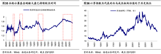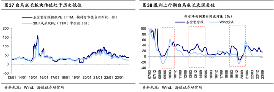 展望24年,宏微观基本面有望持续修复,白马成长或将占优。借鉴历史,以基金重仓股为代表的白马成长板块在A股盈利上行周期内业绩表现更优,09-10年基金重仓股归母净利润累计同比增速均值为27.3%,较Wind全A的19.6%更优(下同),13-15年(24.8%、7.4%)、19-21年(20.1%、9.8%)。我们在前文提出24年宏观经济和企业盈利有望逐渐复苏,参考历史经验白马成长有望在业绩表现上更为占优,未来或将迎来估值重构的反转机会。