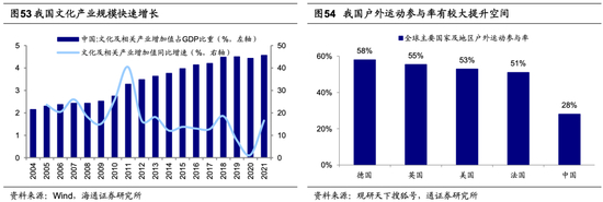 结合当前我国消费存在的新业态亮点,我们认为具体可关注以下两方面:一是政策导向指引下新型文化消费加速发展。2022年8月印发的《“十四五”文化发展规划》提出,要全面促进文化消费,加快发展新型文化消费模式。我们认为,培育新型文化业态和文化消费模式将成为未来文化发展工作的重点,未来文化与其他领域相互融合的消费新业态、新模式有望进一步发展。例如,文化与户外运动相结合的服务消费新业态方兴未艾。户外运动兼具休闲和社交属性,能够较好满足消费者的娱乐、释压需求。根据观研天下搜狐号的数据,当前我国户外运动参与率为28%,明显低于德国的58%、美国的53%、法国的51%,有较大提升空间。此外,还可以关注技术进步推进下智能消费需求释放:正如我们在前文所述,随着物联网、AI、5G等技术的飞速发展,科技类消费的应用场景不断扩展,新的产品和服务正不断涌现,智能消费需求正在快速增长。
