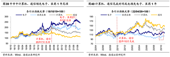 白马成长中重视硬科技及医药。从市场面看,当前白马成长中硬科技和医药板块自21年高点以来调整已经非常显著,电子自21年7月高点以来最大跌幅已达44%、医药最大跌幅达43%,同期沪深300最大跌幅为35%,截至目前电子和医药行业仍然在底部区域徘徊。参考19年以来成长行业的市场表现规律,我们可以发现电子、医药行业在牛市见顶与熊市见底的时间都滞后于计算机、通信等成长行业,滞后时间大约1年左右。具体来看,19-21年的牛市中,计算机和通信行业于20年7月见顶后回落,而电子、医药则滞后1年在21年7月左右才见顶回调。而在22/10市场见底以来,计算机、通信已于22/10见底上涨,而目前电子和医药仍然在底部区域徘徊,估值水平中等偏低,例如医药PE(TTM)为30倍、处13年以来20%分位。往未来看,政策支持和技术突破加速电子细分领域自主可控,老龄化趋势加速医药需求释放,电子、医药行业基本面正逐渐反转,目前处在底部区域的电子、医药行业性价比正凸显。