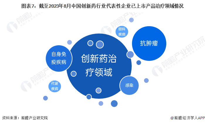 从中国创新药行业代表性企业已上市产品治疗领域情况来看,主要集中在抗肿瘤、自身免疫疾病、感染、代谢疾病等领域。