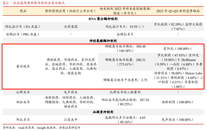 孙建等人进一步指出,奥司他韦原料药供应商包括博瑞医药、华海药业、东阳光药业、金城医药、华软科技、普洛药业、海正药业、人福医药、九典制药和诺泰生物等。2023年前三季度,磷酸奥司他韦颗粒的市场份额由东阳光独占;磷酸奥司他韦胶囊的市场份额中,罗氏制药占据47.43%,东阳光占据19.96%,F.Hoffmann占据9.58%,一品红占据6.88%,齐鲁制药占据4.47%;磷酸奥司他韦干混悬剂的市场份额中,倍特药业占据58.06%,Hetero Labs占据31.51%,博瑞制药占据4.68%,二叶制药占据4.21%,齐鲁制药占据1.06%。